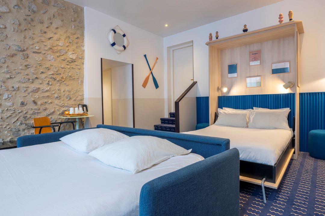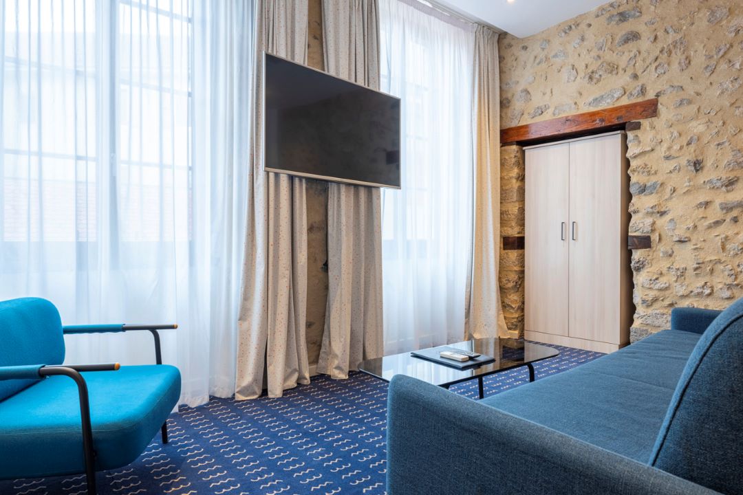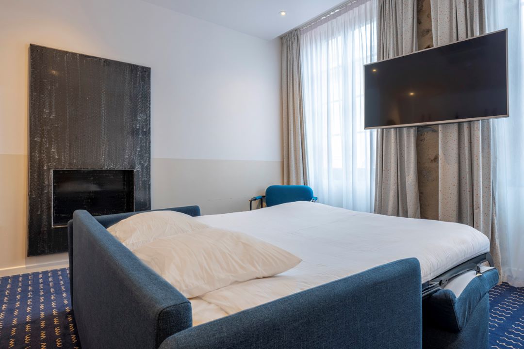 Our 28m2 Family Suite is equipped with a 140×200 cm foldaway bed and a 160×190 cm sofa bed, a private bathroom with shower, a flat-screen TV, a safe, a minibar and air conditioning.